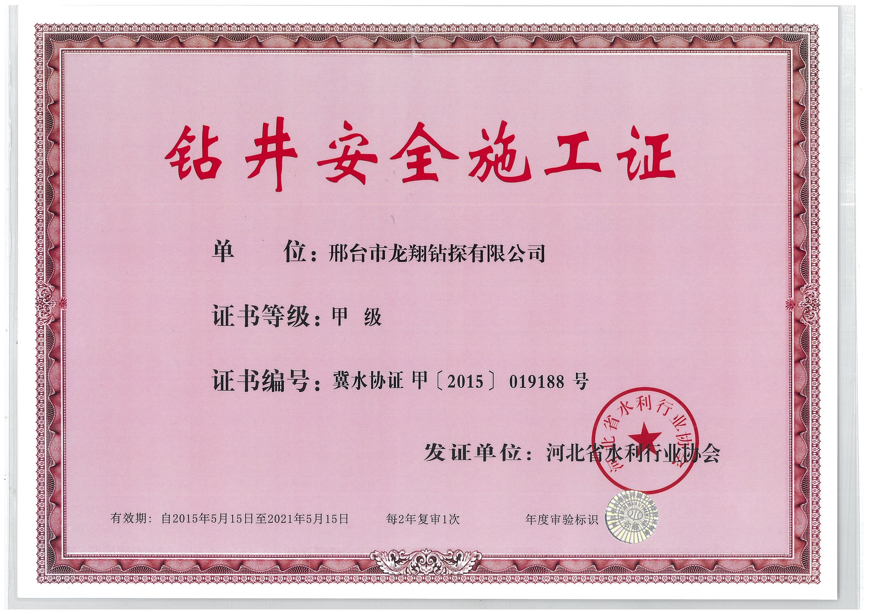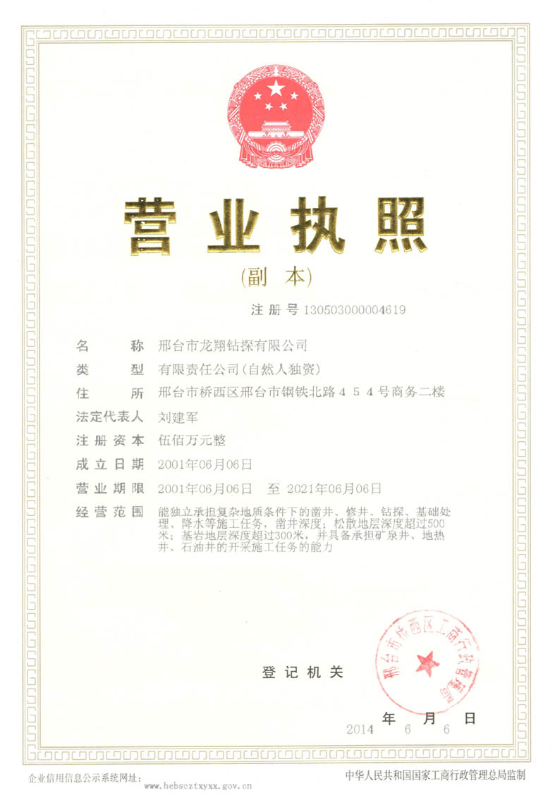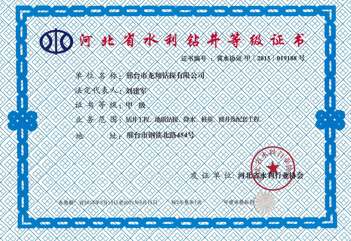 資質(zhì)榮譽 網(wǎng)站首頁 > 關(guān)于龍翔 > 資質(zhì)榮譽 鉆井安全施工證 鉆井施工資質(zhì) 誠信證書 榮譽證書 榮譽證書 邢臺龍翔營業(yè)執(zhí)照 榮譽證書 1 龍翔鉆探公司20年來始終致力于地質(zhì)鉆探工程行業(yè)的企業(yè),本著“用周到的服務(wù)、可靠的產(chǎn)品質(zhì)量讓客戶放心使用”的宗旨,龍翔一直用科學(xué)的設(shè)計、嚴謹?shù)你@探流程、精湛的技術(shù)立志打造出優(yōu)質(zhì)的鉆探工程。走進龍翔,與您共同創(chuàng)造美好的明天! 物探找水 地源熱泵孔 地熱井工程 地熱井工程 地熱井工程 地熱井工程 地熱井工程 公司簡介 聯(lián)系我們 邢臺市龍翔鉆探有限公司 咨詢熱線:18875725353 地址:邢臺市橋西區(qū)地質(zhì)十一隊北院北門內(nèi)路西側(cè)北樓一層2號 網(wǎng)站備案:冀ICP備16011387號-1冀公網(wǎng)安備 13050302000357號 友情鏈接: CmsEasy論壇 九州易通科技有限公司